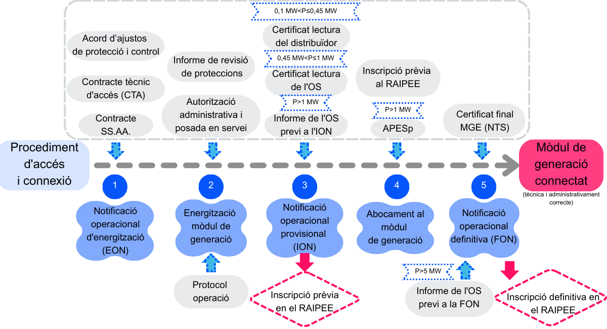 - Notificació Operacional Provisional (ION): una notificació emesa pel GRD al titular d’un MGE que li permet operar mitjançant l’ús de la connexió de la xarxa durant un període de temps limitat, així com iniciar les proves de conformitat per garantir el compliment de les especificacions i requisits pertinents.